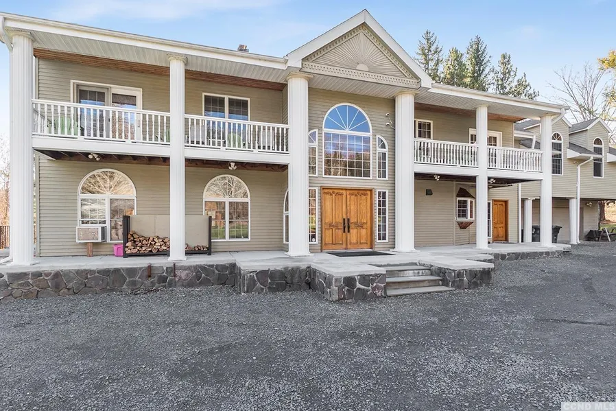 A private, stone walled, park-like setting on a quiet country road, features this grand colonial slated on 44 mostly wooded acres with crystal clear pond and beautiful mountain views. Custom built, the 6,600 sq ft home welcomes you with gleaming wood floors, over-sized windows, exposed beams, and vaulted ceilings. The home boasts plenty of space for friends and family offering 8 bedrooms and 6 Baths. Entertain with ease in the comfortable living room with stone fireplace, billiards room, or in the tremendous chef's kitchen equipped with top of the line appliances including Decor and Bosche. A second staircase leads to a private guest wing located above the garage. You'll find multiple outdoor spaces inviting you to relax, including several balconies, deck, and hot tub. The 2 car garage is the perfect storage for all of your country toys, i.e. snowmobiles, atvs, & hunting equipment. Just 2 hours from NYC/10 mins to Windham & Hunter skiing makes this the ideal Catskill Mountain Retreat