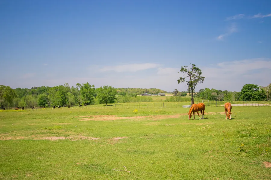 HORSE IMPROVEMENTS -- 40'x185' Metal Horse Barn w/ 24 Stalls w/ lights, electric outlets and water source in each stall (option for 2 more or 1 large foaling stall); Large concrete wash area, pipe stock, Kitchenette area w/ cabinets and sink. Half Bath w/ water heater and septic in Barn. Stalls are steel framed with wood boards and Barn has double-sliding door on each end. 105'x62' Red Wood Barn w/ covered overhang equipped w/ 12 stalls and 6 double stalls all w/ concrete bottom covered with sand. Enclosed Feed Room on Slab w/ electric, Concrete wash area (gas line run for water heater not currently connected), wired for spray system (not currently connected) and water lines to every stall. Red Conex building used for tack room or feed storage. Large, Lighted Round Pen w/ power ran underground. Pipe runs for cattle working area. Square Working Arena with lights. Stud Shed w/ 7 stalls, water and lights. 78'x40' Open Metal Building w/ Small Storage Building, electric. 6 Dog Runs. Horse Walker. 3 Turn-out pastures with sheds and water source and 1 larger pasture for cattle.