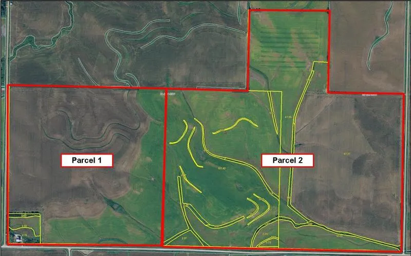 Parcel 1: 160 acres, m/l, with 149.4 crop acres and CSR of 63.4. Includes House and Outbuildings.