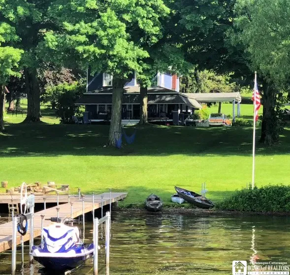 Nestled along the shores of Chautauqua Lake in Bemus Point this charming lakefront home offers a tranquil escape w/ breathtaking views captivating sunsets. Boasting 100ft of coveted lake frontage, this property presents a rare opportunity to own a slice of paradise in one of WNY's most desirable locations. The home features 4 BRs along with a large lake-facing living room, dining room eat-in kitchen. Hardwood floors throughout along w/ beautiful built-ins cabinetry. Outside, the wrap around porch provides lake views plenty of room for outdoor seating dining. The spacious front lawn leads you down to the water’s edge. Spend your days swimming, boating or fishing from your own private dock. In the carriage house there is parking for 1 car and a great bunk room that sleeps 4. There’s also a full bathroom laundry. Could be converted to an in-law suite. Just minutes from downtown Bemus Point, explore charming shops and cafes or walk or bike through the 300 acres of nearby Long Point State Park. Recent updates include a new furnace a new well drilled 2 yrs ago. Add'l building lot also available for sale see MLS R1525891. Delayed negotiations until Mon. 3/25/24 at 1:00PM