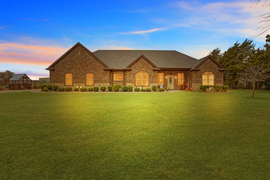 Better than new, one owner, custom built, brick and stone home, featuring 4 bedrooms, with an office (which can easily be a 5th bedroom) and a fantastic oversized 2.5 car workshop with epoxy floors, all on 1.5 acres, where your chickens and animals are welcome. Location is important and you are minutes to State Hwy 380, which is your route West to McKinney and East to Greenville, all while in Hunt County. The home features a chef-ready kitchen with granite countertops, breakfast bar, and walk in pantry. Retreat to the primary bedroom, with a sitting area, and ensuite bathroom with granite countertops, a relaxing jetted tub, separate shower, double vanities and walk in closet with built ins. Boasting upgrades you would expect, you will appreciate the engineered hardwood floors, ample storage, granite in all the bathrooms, round countertop edges and West facing remote window shades. Rest assured, when Texas has a storm, your power will stay on because of the automatic whole home 38 Kw Generac Generator. The standard 2 car garage is attached. However, take a look at the stand alone, bougie, 2.5 car, epoxy floor workshop, measuring 27x27 with a 8 foot overhang. When your sent to the dog house, this is where you get to go... life is good. The black wrought iron fenced back yard is complete with a pergola covered patio. The stars are big and bright in Texas and you get to enjoy them from your firepit. Your plants will love the 8x8 Yoderbilt greenhouse. The yard is big and open, featuring producing pecan trees, an integral sprinkler system, and a 16x12 storage building. Look at the 3D tour and see for yourself. All this with gentle deed restrictions to protect your investment. Information deemed reliable but Buyer should perform due diligence.