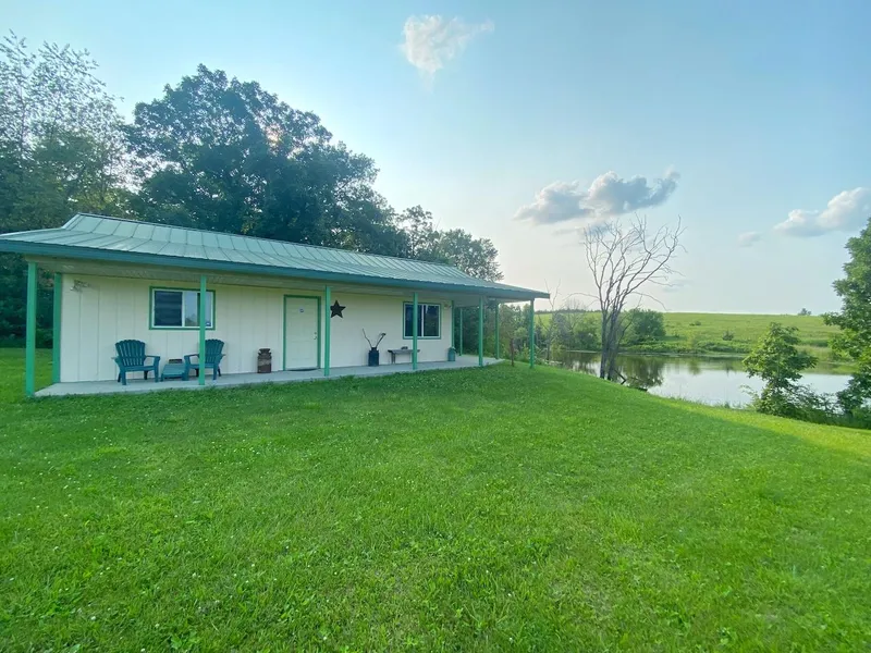 Included in this secluded acreage is an 816 square foot cabin that was built in 2006. This home features a wrap-around porch that offers great views of the 4-acre m/l pond that has been stocked with crappie, bluegill, bass, and grass carp. When you enter the cabin from the wrap-around porch you are welcomed into a cozy atmosphere with an open concept from the living room area to the kitchen.