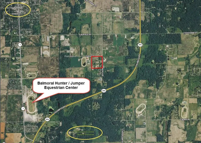 45 total acres in Crete Township, Will County Illinois. Nice combination of tillable and wooded acres. The farm is near the Balmoral Hunter/Jumper Equestrian Center (former Balmoral horse race track). The general area has many equestrian farms.Easy access to Rt. 394.