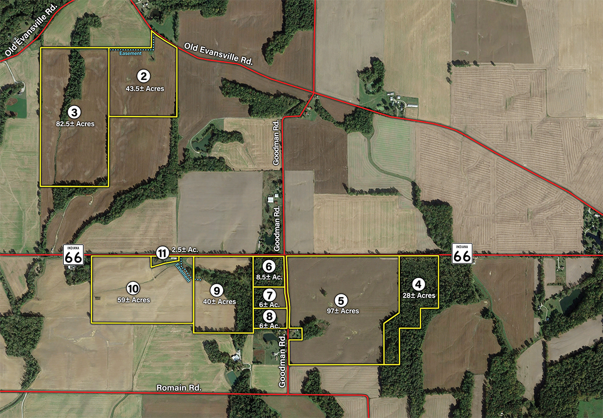 Tracts 2-3: Located along Old Evansville Road, 1-mile north of Indiana State Road 66, and west of Goodman Road.