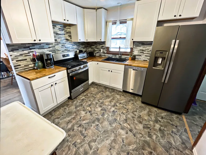 This home offers an open layout between the kitchen and dining area. Dining area has sliding patio doors to the backyard. The living area has large, new windows offering great natural light. Also located on the main level, is the master bedroom with double closet and en-suite bathroom. The bathroom can be accessed either from the bedroom or also the hallway. Also, located on the main level are two additional bedrooms and the laundry is located off the kitchen by the back entrance to the home. The kitchen has been fully remodeled featuring new kitchen cabinets, countertops, backsplash and appliances. There is also a pantry and linen closet in the hallway. Anyone who loves to cook will appreciate the gas range in the kitchen.