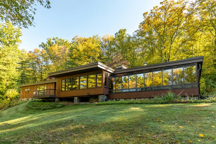 This 1956 Contemporary designed by modernist pioneer William Lescaze is in keeping with modernist architecture philosophy, with functionality and views at the forefront of the design. The spatial impact the numerous windows have is dramatic, cocooning one in the surrounding canopy of trees. At the same time, the open floor plan gives a contrasting sense of space the resulting feeling is that of being held and released. With 46 acres, the home's views remain untouched and offer a true escape; wander through the woods and enjoy the sounds of the waterfall or stream. This home is for those seeking to live without walls and those who wish to find inspiration and serenity from the New England landscape.