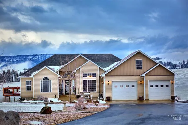 Panoramic views from this 3600 sq ft home nestled on 13 acres and only 7 minutes from town on the Camas Prairie. This 4 bed 3.5 bath has a grand entrance and staircase leading to the large family room downstairs. Two decks to choose from: one off the master bedroom or an extra large deck off the living room. Interior features include propane fireplace, heat pump, surround sound, instant water heater, wine fridge, trash compactor, kettle faucet, main floor master w/ jetted tub and walk in shower, granite counters in kitchen and bathrooms. Outside features: 40x60 ft shop w/twin 12x60 overhead lofts, also has twin 12x60 covered sides and open ended lean twos. Inside the shop is a 8x10 walk-in cooler, full bathroom, partial living area & Toyo stove. Barn/machine shed is 24x48, with power & water, high fenced garden area, maple, oak, & apple trees. Automatic sprinkler system and drip for landscape; 7 water spigots, Approx 40,000 sq ft of pavement w/ gated entrance, and 27 additional acres available.