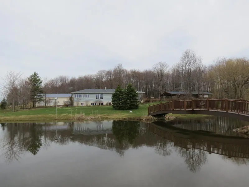 47 Acre Country Estate - Perfect for a business or hunting retreat, reception facility for weddings and graduations, or a B&B. 3 Bedroom, 3 bath Bi-level home with over 6,000 sq. ft. of energy efficient finished living area overlooking landscaped yards, stocked ponds with fountains and bridges, swimming pond with platform, dock, and bridge to island. Huge outdoor pavilion and picnic area with kitchen, water, and sewage hook-ups. Attached and detached garages. Whole house generator. Natural stream and extensive trails through the woods. AHS Shield Plus home warranty included. MLS 46103