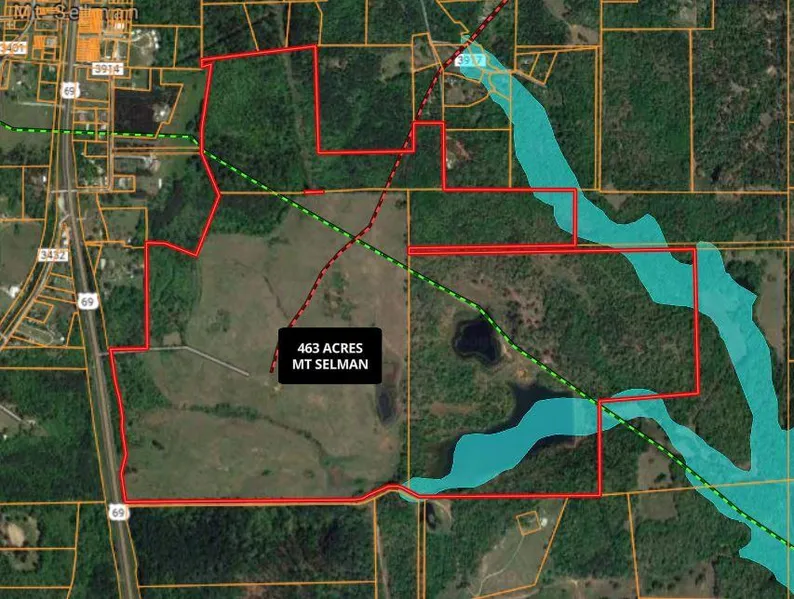 463 acres available in Mt Selman between Tyler and Jacksonville. The property has Hwy 69 frontage with a +/-3 acre pond and a +/-18 acre lake. The property boast rolling terrain and a mix of pasture and woods with approximately 300' of elevation change which results in spectacular views.