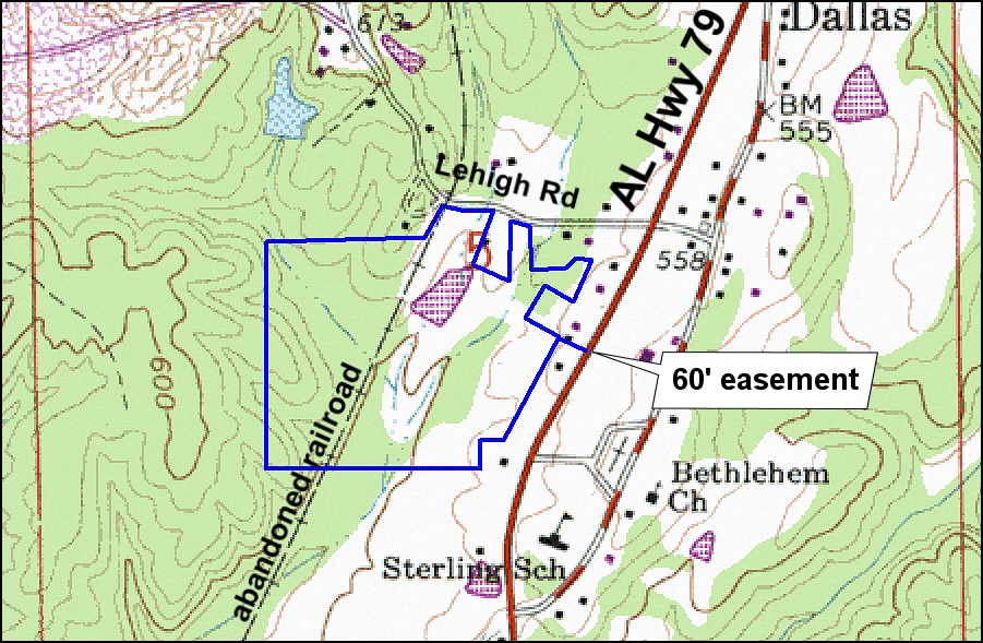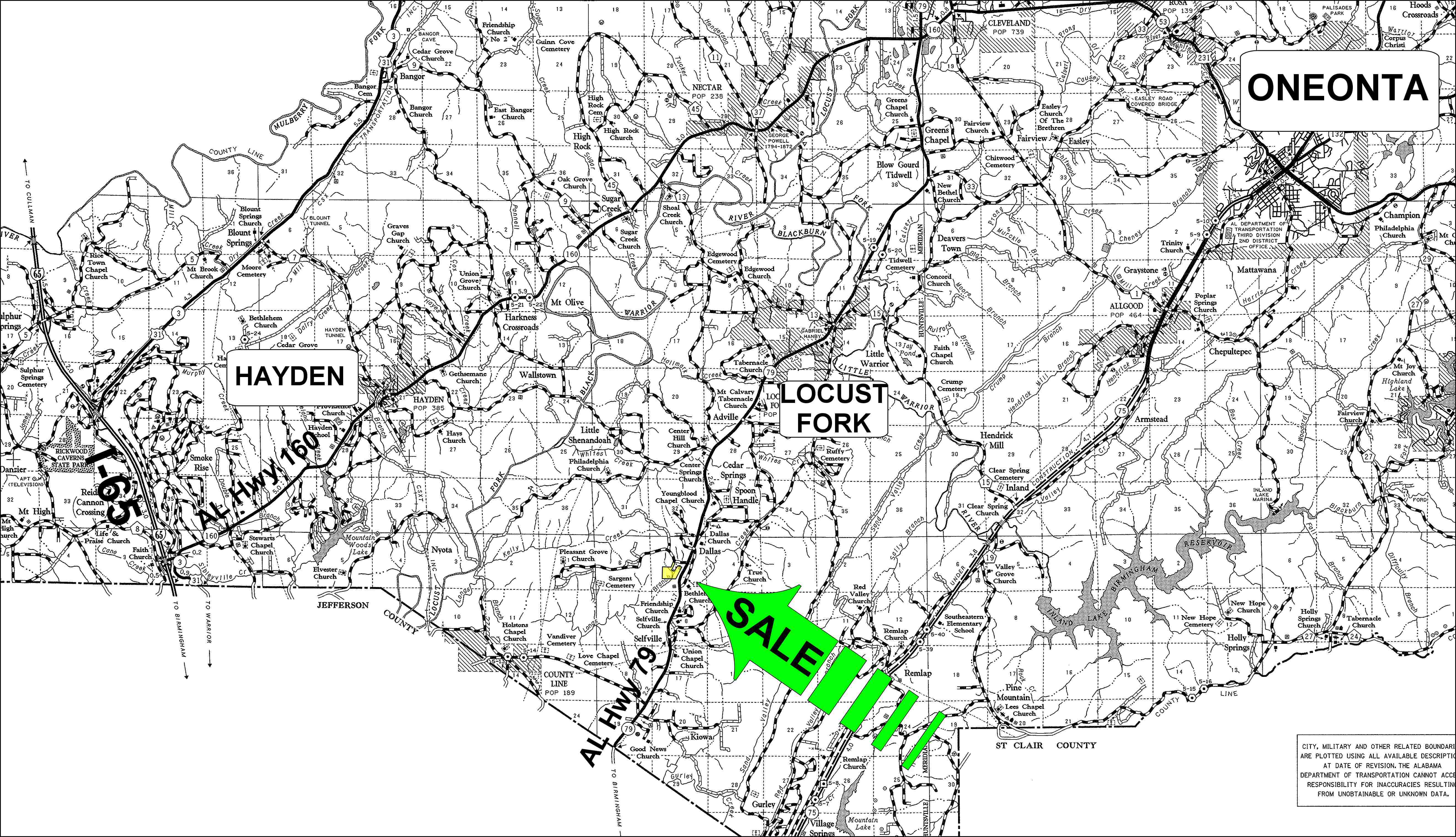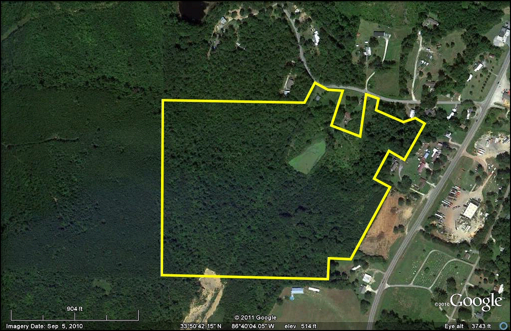 Research Parcel InformationFrom the intersection of I-20/59 and US Hwy 79 (Exit # 128) in Birmingham, go north on US Hwy 79 (Tallapoosa Street/Vanderbilt Rd) toward Blount County for 23.0 miles. Look for Hicks Poor Boy Store (on the right) and turn left onto Lehigh Road. Continue 2/10s of a mile to the property on the left. Look for the Cyprus Partners sign in front of an old white farm house (this house and a small pond behind it are not included in this sale). The access road is the old railroad grade adjacent to the white farm house.