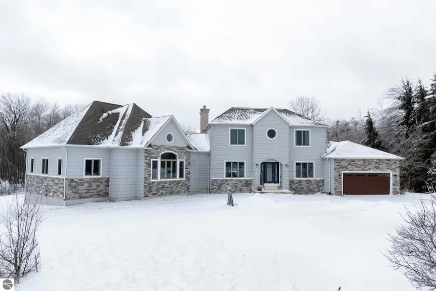 This one-of-a-kind property offers luxury living, recreation, and endless possibilities all in a private, breathtaking setting on nearly 50 acres. This expansive home offers 6 bedrooms and 4.5 baths, thoughtfully designed for entertaining, and retreat-style comfort. The main-level primary suite is a true sanctuary, featuring a nursery, two large walk-in closets, and a spa-like bath complete with an infrared sauna, dual shower heads with jets, bidet, and custom cabinetry. There is also an office adjacent to the primary bedroom. Laundry room has a dog bath and a laundry pure system that they use in hospitals. A second upper-level primary suite includes its own fireplace and private bath, creating an ideal guest or extended-family space. The lower level features a spacious family room with walk-out access, wet bar, bedroom, full bath, and abundant storage perfect for entertaining or everyday living. Outdoor amenities truly set this property apart, offering nearly 50 acres of natural beauty with established ATV and snowmobile trails, a scenic bridge in the woods, and a stocked pond with deck, electricity, and water pump. Enjoy evenings around the stone firepit with built-in seating and take advantage of the productive vineyard with grapes and raspberries, all surrounded by serene, private surroundings. A standout feature is the 5,000 sq ft pole barn, complete with concrete floors, multiple oversized doors, RV hookups (30 & 50 amp), enclosed vented workshop with keyless entry, plumbing, loft storage, industrial shelving, and a hoist. The property also includes a private Man Cave (24 x 25 ) with its own heating and cooling, bar with sink, stage, projector and screen, new windows, insulation, and separate keyless entry. Additional highlights include over 2,000 sq ft of unfinished space ready for customization. Experience exceptional privacy, luxury, and versatility in this remarkable estate!