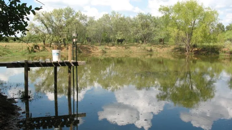 The visual impression of this little ranch is very positive from the moment you drive up to the front gate--even before you consider the production, recreational, and residential possibilities. The front (west side) of the property is mostly open coastal pasture that has been cut and fertilized regularly and is in great shape. About 17 acres has been fenced off on the northwest corner to be used especially as a hay field and a set of working pens have been built near the middle of the property. This handy little place is used for both hay production and livestock grazing as well as recreational uses. The back side of the property is crossed by a seasonal creek and is nicely wooded with a variety of large trees. The neighboring properties are low-fenced, large acreage ranches allowing deer and other wildlife free range. The seller will be leaving a couple of hunting blinds and feeders. A 6-wire fence was constructed along the west boundary of the property about 2 years ago. The other perimeter fences have been re-worked and are in good condition and new water gates built in the fence at the places the creek enters and exits the property. A nice stock pond captures rainwater runoff and provides water for livestock and wildlife as well as fishing opportunities. It is stocked with catfish and black bass that like to be fed from the fishing pier. A 3-room metal building has been converted to a weekend-get-away cabin with a 9x17 front room, 12x24 kitchen/living area, and a 12x24 bedroom & bathroom. The kitchen appliances, window a/c units, water heater, and 250-gal propane tank will stay. A second metal building houses the water system and has a large storage room. The water system includes a well that produces an estimate of 3.5 gpm using a submersible pump, motor and electrical system with low water cut-off protector and a 1500 gallon storage tank.