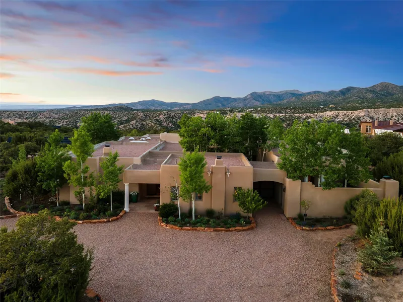 This gated 5.2-acre estate in the Sangre de Cristo foothills is only 18 minutes from the Santa Fe Plaza and offers panoramic views of the Sangres, Jemez Mountains, and Badlands. 4,752 sf living, 802 sf 2-car garage, 5 portals totaling 1,820 sf. of outdoor living space! 880 sf portal wraps the central, Aspen shaded courtyard with large stone fountain. Beds and gardens are filled with a vibrant array of flowers, grasses, and trees. West facing portal offers dramatic sunsets with lovely outdoor eating area. A private walled garden off the primary suite includes a smaller portal and outdoor fireplace. Interiors are warm, and light filled with a wide choice of cozy private and formal entertainment spaces. Rich interior finishes focus on traditional and timeless New Mexican details, beamed and wood plank ceilings, meticulously cut flagstone floors, Diamond plaster walls, 4 interior fireplaces, custom cabinetry, granite, sandstone counters and 10 skylights. Constructed with 2’ to 4’ thick Pumice-Crete walls, a labor-intensive, fireproof building method that beautifully replicates the look and feel of traditional triple-stacked adobe and is noted for its beauty, stability, noise reduction, and energy efficient qualities. Radiant floor heating, recently installed high efficiency AC condenser system save energy by preheating water for the propane fired boiler and converts to a chilled floor cooling system during summer months! Low profile solar panel system produces more power than the residence uses yielding monthly electric bills less than $12.00/month! A cozy family room, formal dining, kitchen, and spacious great room, all access the courtyard for spectacular entertaining or intimate gatherings. Two separated primary suites plus office with tasteful built-ins. New improvements include stone planters and driveway borders, native trees, grasses, shrubs and flowers, new landscape irrigation system, new roof with extended warranty, new skylights, refreshed exterior stucco.