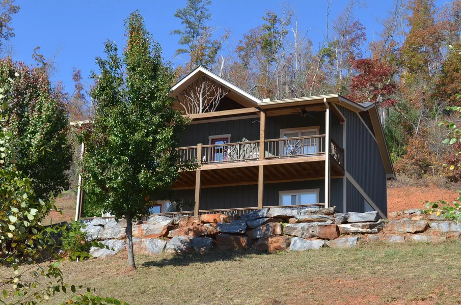 Views of Mountains and Lake Burton. 2500 sq ft of quality living. 3br/2.5 ba. (3rd bedroom has no window). Generous master suite, wood floors throughout. Granite counter tops w/ live-edge bar and metal tiled back splash in the kitchen. Vaulted ceiling w/ pickled pine. Finished full daylight bsmt w/ tile floors, large Den. Double decker porches. Metal roof and fairly new appliances. 1.21 leased acres from GA Power, $525/year. Rustic touches w/ log and tree spindles and rails. Central HtPmp. Private well. Open land w/ garden area. Easy access to Lake Burton through LaPrade's