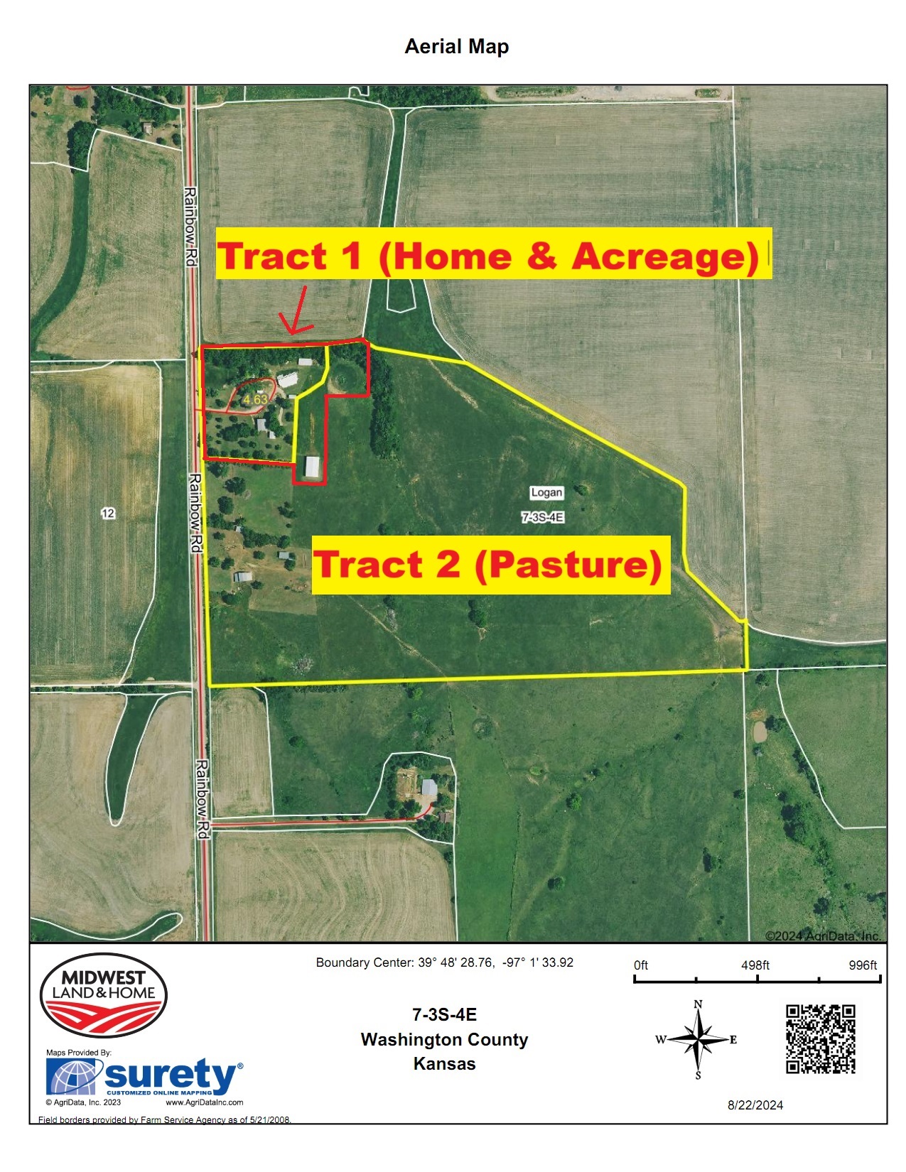 Legal Description: A tract of land in the Northwest Quarter of Section 7, Township 3 South, Range 4 East of the Sixth Principal Meridian, Washington County, Kansas described as follows: Beginning at the Southwest Corner of the Northwest Quarter of said Section 7; thence N 000746 E 919.00 feet along West Line of the Northwest Quarter of said Section 7; thence S 853249 E 395.80 feet; thence s 044328 W 57.14 feet; thence S 864257 E 124.24 feet; thence N 032914 E 326.08 feet; thence S 863046 E 170.00 feet; thence N 032914 E 232.00 feet to an existing fence line; thence Along the existing fence line the following 5 courses, Course 1: S 892718 E 57.95 feet, Course 2: S 763649 E 310.83 feet, Course 3: S 595030 E 1036.09 feet, Course 4: S 014959 W 337.04 feet, Course 5: S 445935 E 338.94 feet; thence s 000558 W 185.06 feet to the South Line of the Northwest Quarter of said Section 7; thence S 893439 W 2204.40 feet to the point of beginning, containing 49.4 acres.