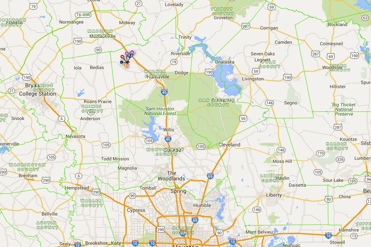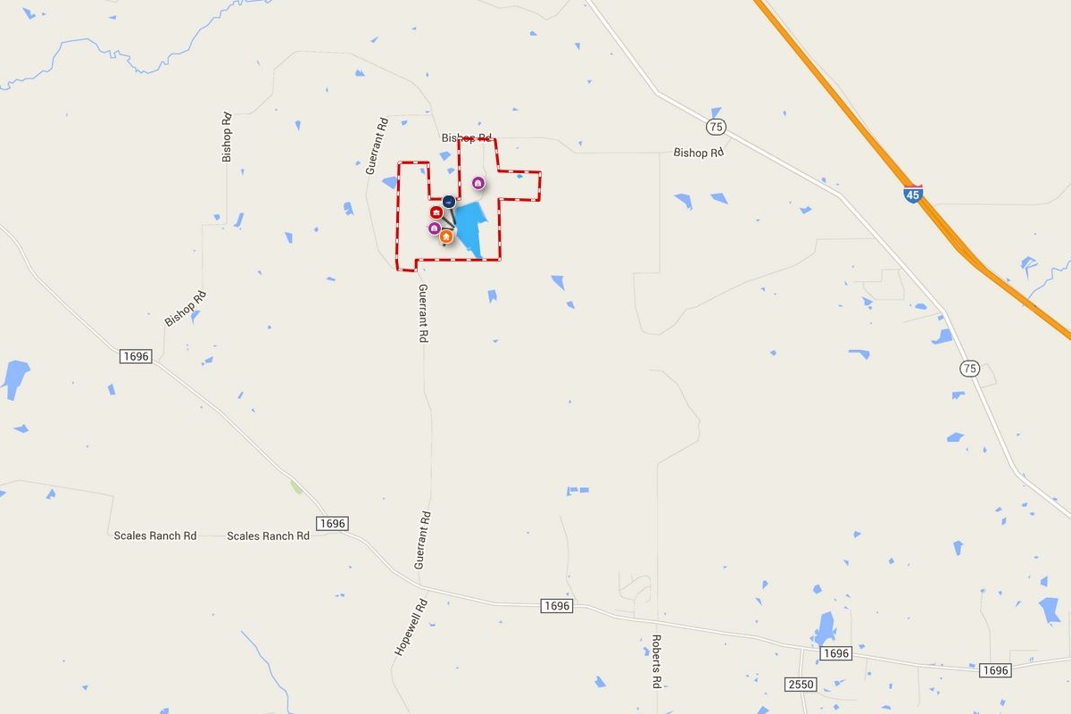 Follow I-45 7 miles North of Huntsville to FM 1696 and Exit #123. Turn left on FM 1696 and follow for 1.5 miles to SH 75, turn right. Follow for 5.2 miles to Bishop Road, turn left. Follow for 2.2 miles to property on the left.