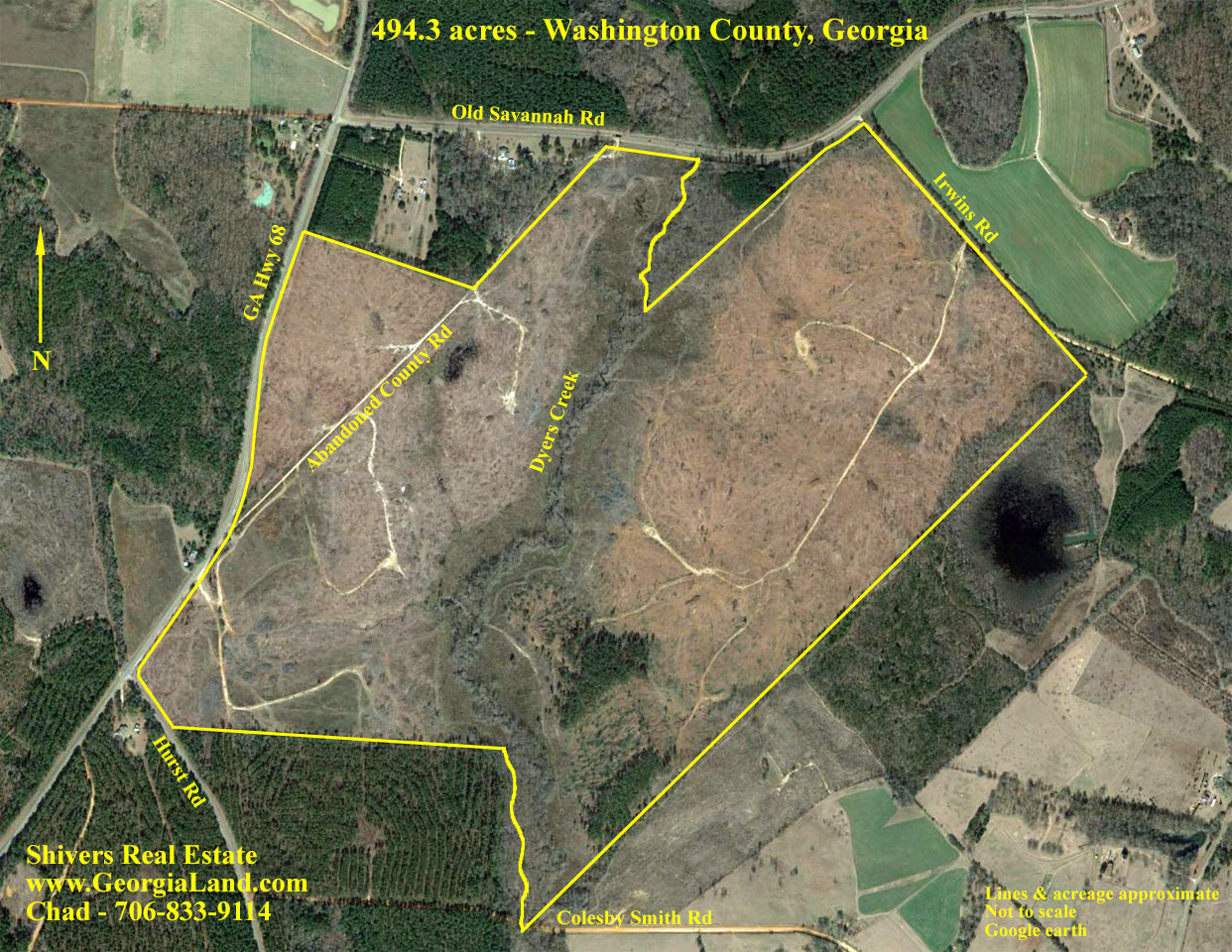 Long paved frontage on Georgia Hwy 68, paved frontage on Old Savannah Road and Hurst Road, frontage on Irwins Road
