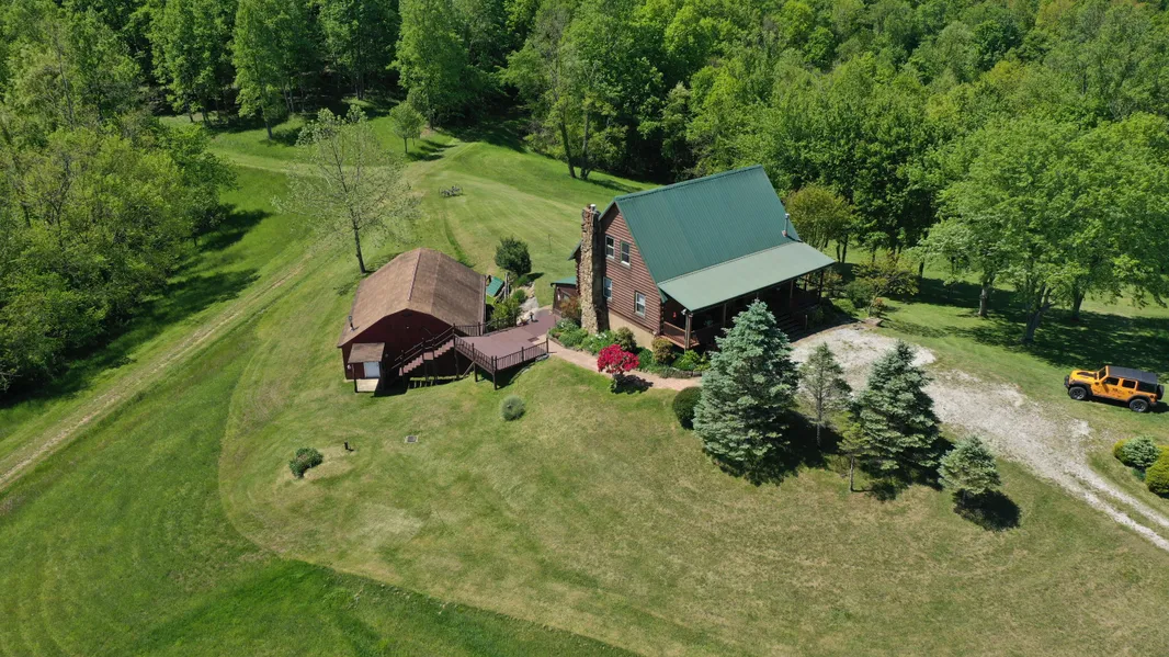 Mountain Log home of your dreams. The hilltop views are absolutely incredible. This 4 bedroom Home with FREE NATURAL GAS features lots of character. The spacious great room boasts rustic beauty with its living room, dining room, and well-appointed kitchen. The family rooms focal point is a field stone fireplace that has real field stone gathered from the farm. The green thumb of the home will go off the deep end when they lay their eyes on the attached green house. The outbuildings include a new 2 car garage with a She Shed, a barn/RV storage building, chicken house, and an additional barn. This farm located on a dead end road has beautiful hilltop meadows with fruit trees, along with nature filled mature woodland. Watch the drone video and weep those happy tears that you found your forever home.
