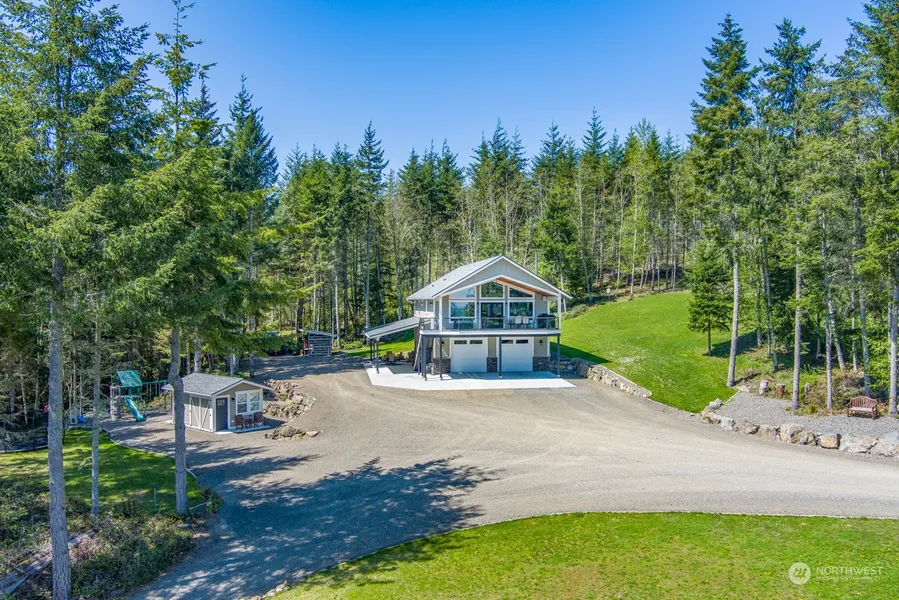 Gorgeous drive up gives way to a stunning modern property situated on a private 5 acre lot on Discovery Bay. You'll feel like you are up in the clouds where the VIEWS are amazing! Step inside this beautifully designed home & fall in love w/its open spaces incl: 2 bed 2 baths (w/heated floors), & beautifully appointed kitchen. Not only is this home lovely, it's versatile: at 1250 sq.ft is can be considered an ADU while you build your dream home OR make this your primary home by building out the 1250 sq.ft on the lower level. LL currently boasts wet bar, 3/4 bath Murphy bed & ductless mini-split. Come--enjoy dinner on the porch under the lights while listening to music or sip coffee while watching the glorious sunrise! It is heaven on earth!