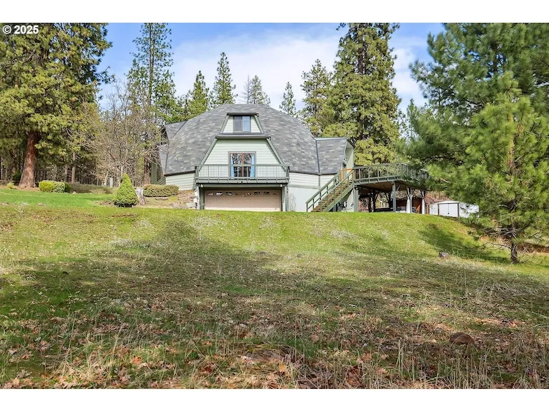 This stunning 3,984 square foot geodesic dome home, nestled on a 5-acre wooded lot with towering Ponderosa Pines, offers a unique living experience. With 5 bedrooms, 3 bathrooms, and features like soaring vaulted ceilings, a spiral staircase, and a third-floor master suite with an office space and sitting area, open to the floor below, taking advantage of the wide open spaces the dome provides. Beautiful wood burning stove in the great room and additional pellet stove in the lower level family room help keep the home toasty warm on the cold winter nights. Large open island kitchen with laundry room and pantry close at hand. This home provides luxurious functionality. The property also includes a 2-car garage with a workshop, a covered patio, a large entertainment sized deck, a swing set, fenced gardening space and a gathering fire-pit area. Located just a short 5 mile drive from Goldenda...