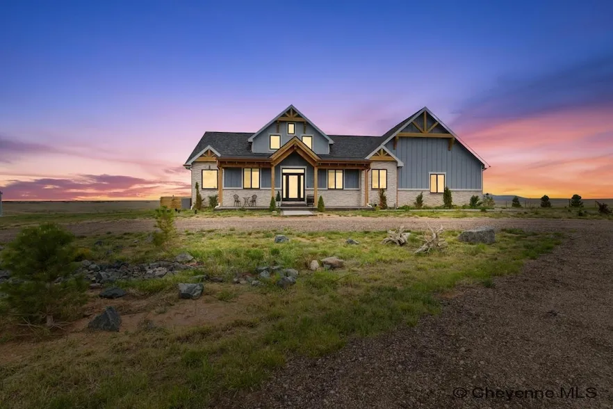 A Cheyenne Show Stopper farmhouse ranch amidst the Wyoming Wow landscape! Entertain all the family and friends, work from home in your idyllic office, and take in the serene landscape with South-facing views surrounding you on 5 acres. Soaring ceilings compliment the open-concept great room with an impressive rock mantle with see-through indoor/outdoor fireplace. Relish your time outdoors on the massive, covered patio artfully designed to capitalize on the magnificent sunsets. Cherish family time in the fully finished basement complete with 2 living rooms, wood stove, and a large projector system for the big game. Over 4800 finished sq ft total; including 5 bedrooms, 4 bathrooms, office, butler s pantry, 2 laundry rooms, full kitchen in the basement for family/ guests, and a whole home generator. Love to tend your garden? Enjoy your personal outdoor retreat with 450 trees plus a fruit orchard ALL ON A TIMED DRIP SYSTEM and adorable garden shed for easy maintenance, optimizing your enjoyment. Too many features to mention- come and experience the Wyoming Dream today!
