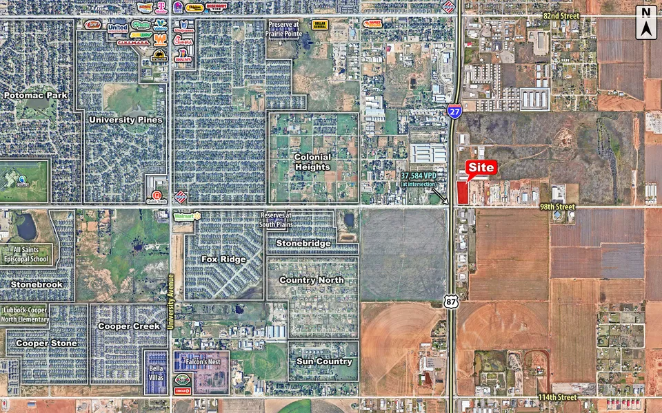 This high-exposure commercial tract offers direct access to a major arterial corridor with strong daily traffic counts, making it ideal for retail, service, or mixed-use development. Proximity to Lubbock-Cooper High School, Middle School, and Central Elementary supports a robust local demographic and workforce. Ongoing residential developments in the area are driving continued population growth. Accessibility is further enhanced by interstate/highway traffic. All utilities are available at the site, and the corner frontage provides optimal visibility and ingress/egress, appealing to national retailers, medical users, and developers targeting this high-traffic corridor of south Lubbock.