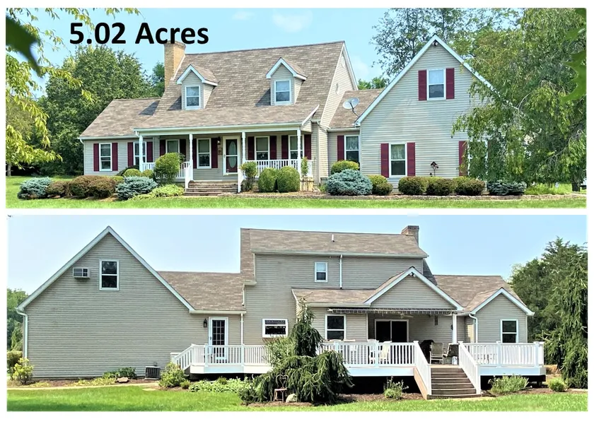 Well cared for Cape Cod home on 5.02 Acres. Community allows horses. Onsite well and septic, so no monthly water or sewer bill. Master suite has upgraded bath with jacuzzi soaking tub and tile shower...located on main level. Back yard is completely private. Large back deck...perfect for entertaining. Finished area above garage for total of 2360 sq. ft. Large storage shed in back yard. Oversided garage.