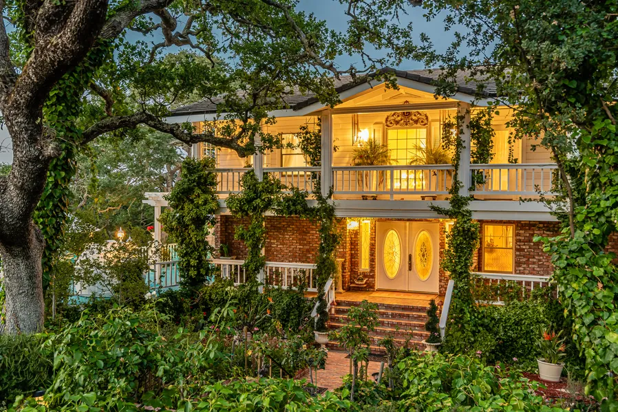 This extraordinary Southern Colonial custom home unlike any other with spectacular grounds and custom design highlights throughout the 3,287 Sf. home. Welcomed by a grand first impression from the gated entry to impeccably maintained landscape and thoughtful architecture. Expertly designed to enjoy the elegant transition from indoors to outdoors on the multiple deck, balconies and verandas perfectly situated for sunset glimpses and effortless entertaining. Filled with refined finishes of marble tile, impressive ceilings, custom column features, crown molding, atrium doors and custom cabinetry. The entry sets the tone with access to the formal living room and library as well as formal dining room and kitchen with a dramatic staircase that leads to the upper-level bedrooms. The kitchen is beautifully outfitted with recent upgrades of granite countertops, pantry, elegant finishes and captivating views from the windows and deck access. Marble flooring extends into the spacious master suite with a gas fireplace and luxury bath retreat of double vanity sinks, jetted tub, glass shower, custom walk-in closet and access to private veranda. All bedrooms are located on the third level, main living space on second level and garage with guest suite on the first level. Lower level of the home offers a finished two car garage, laundry room and guest suite accessible from both the foyer staircase and the garage. Additionally, there is a 1,402 Sf. detached workshop with a 700 Sf. 3 car garage complete with a concrete tile roof, blend of stucco and brick exterior and clock featured at the highest point of the roof. Nestled peacefully in a majestic setting of tranquility of panoramic views and lush landscape the nearly 5 acres include a koi pond with rock waterfall, filtration system and screen surrounded by a variety of palm, oak and evergreen trees.