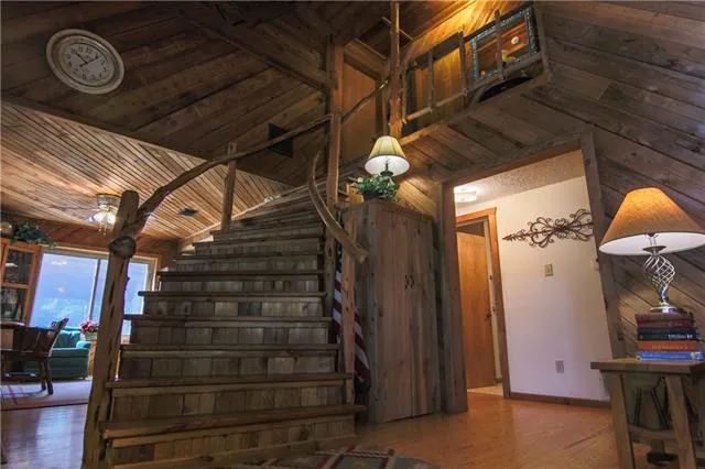 Stunning property, built off of a cabin plan! You will not find anything like this one! Colorado style, one of the coolest staircases you'll ever see! Was made from wood on the property! 3 bedroom with 2 full baths, master bedroom is downstairs. Awesome river rock designed fireplace, wood burning with blowers! The front porch is so big and could place lots of rocking chairs there and feel the spring wind! Something you'll wonder there is a piece of England that stays in the bathing room downstairs! Apartment in the metal shop, big open living with bedroom, full bath and kitchen. When you go to this property you really need to walk all around to get the full park like awesome feel!! Box A