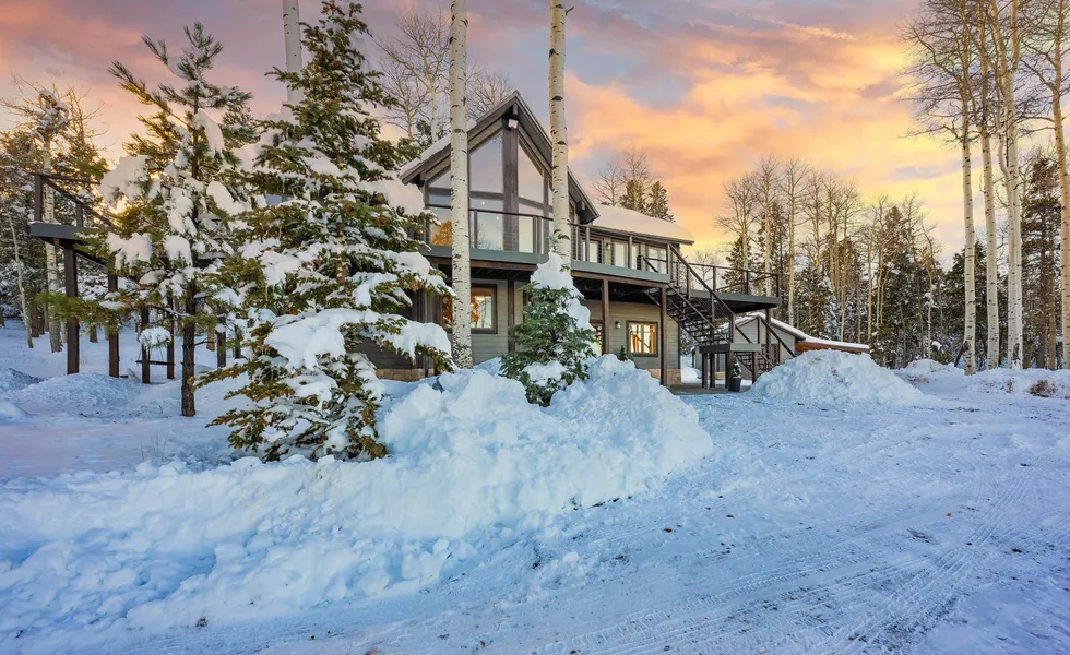 This home is gorgeous, luxurious and modern while maintaining mountain rustic charm. Incredible views throughout this 5-acre property, whether you're sitting in the hot tub, living room or playing outside, you'll have views from Baldy, Angel Fire Resort, Monte Verde Lake all the way down to Black Lake, encompassing all the magic that the Moreno Valley has to offer. This home has been lovingly renovated and every detail thought of. Entering the home on the ground level, you're greeted by a heated, oversized luxury mudroom with built in storage, ski/snowboard hangers and Elk chandeliers. There's plenty of room for extended family & friends to drop all their outdoor gear here, making it a breeze for lots of people in this home. On this first level, there is an attached heated single garage, 3 bedrooms that are equipped with bunk beds, a full bathroom and a spacious secondary living area. The living area boasts a dry-bar, shuffleboard table and a cozy lounging area with a projector. Heading upstairs is the large living area with Chalet style windows showcasing the amazing views, with an open design, there is the dining area and kitchen that also share the views. A Chef?s kitchen is where no expense was spared, high end KitchenAid appliances, gorgeous mitered edge countertops house the large double range, completed with a pot filler. There is an additional wall oven so holiday favorites are never missed and plenty of room for all the cooks in the kitchen. A hallway connects a pantry, dedicated office space, laundry room, bathroom and lastly, the primary suite. Primary Suite has an oversize double walk-in shower, dual sinks and a walk-in closet. Just steps outside the primary suite is the hot tub with a view! 3-sided wrap around deck connect the upstairs areas and makes for great outdoor living and wildlife viewing. The lot is beautifully thinned and has magnificent mature Aspens, that showcase their colors in the Fall. There is a great firepit area for sitting outside to enjoy our cool mountain evenings. Not only does this home boast big views, it has an easily accessible driveway, which is a rare combination! A single car garage with carport to store another vehicle or all your mountain toys.