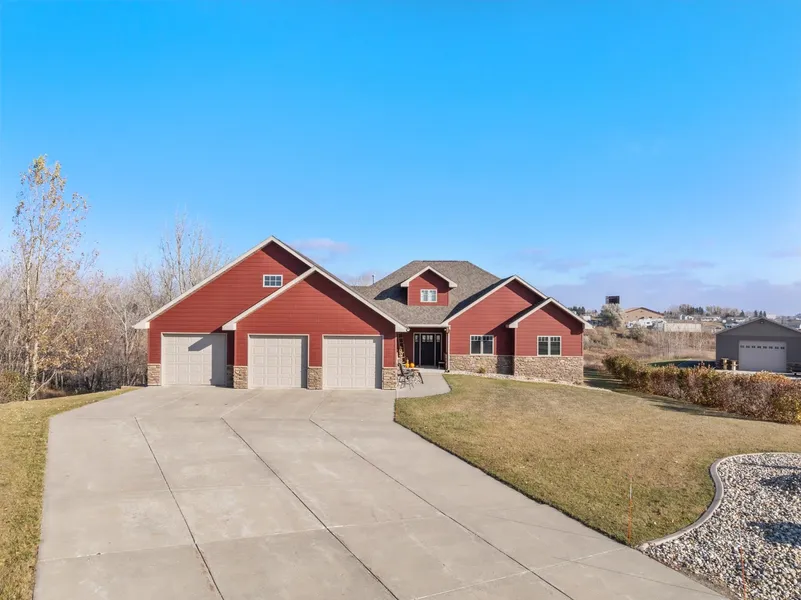 Welcome to your custom dream home, where luxury meets nature in a serene private setting, only minutes from Minot! This stunning five bedroom, four bathroom, 5,308 SQ FT custom-designed home sits on a sprawling 5-acre wooded lot with a pond offering privacy, luxury, and comfort. From the moment you step inside you will be captivated by the quality craftmanship and thoughtful details throughout. The grand living space features vaulted ceilings and expansive windows that bring in natural light. Engineered hardwood floors throughout the main level compliment the beautiful cherry cabinets and stunning granite countertops in the kitchen. Step into a dream kitchen featuring a large central island that provides abundant workspace, two pantries, and a generous amount of cabinet and counter space. The rich knotted alder trim and doors throughout the home brings a touch of rustic and elegance to this space. There are four spacious bedrooms, including a luxurious primary suite with deck access, large walk-in closet, and an ensuite with a custom tiled shower and double sinks. Additionally, a versatile office could easily be transformed into a fifth bedroom, if desired. The fully finished walk-out basement is a true showstopper, with etched, heated concrete floors and a cozy fireplace. This lower level with added game room space and a wet bar is perfect for both relaxation with the family or hosting guests. Walking outside from the basement, you will find a spacious paved patio and an already laid concrete pad and electrical in place for a hot tub, perfect for outdoor entertaining and relaxation. The expansive upstairs bonus loft is pre-wired for a projector and offers endless possibilities as a media room or additional living space. Off of the garage, appreciate the thoughtfully designed mud/laundry room that combines functionality with style. This generous space offers beautiful cabinets, extra counter space, and a conveniently located laundry area. The attached, oversized three-stall garage with heated floors, water hook-ups, and floor drains, provides year-round comfort, and offers ample space for vehicles, storage, and workshop needs. Enjoy the peaceful surroundings on your expansive deck, perfect for morning coffee or evening relaxation. Explore the wooded acreage, or unwind by your private pond, providing a serene backdrop for this remarkable property. A state-of-the-art security system provides peace of mind, while an integrated sound system throughout the home creates a seamless entertainment experience. The home also includes a central vacuum system for added convenience. This home is a rare find, whether you are seeking a quiet retreat or an entertainer's dream, this property offers it all. Don't miss the opportunity to make this meticulously crafted home yours today. Contact a Realtor to schedule a showing.
