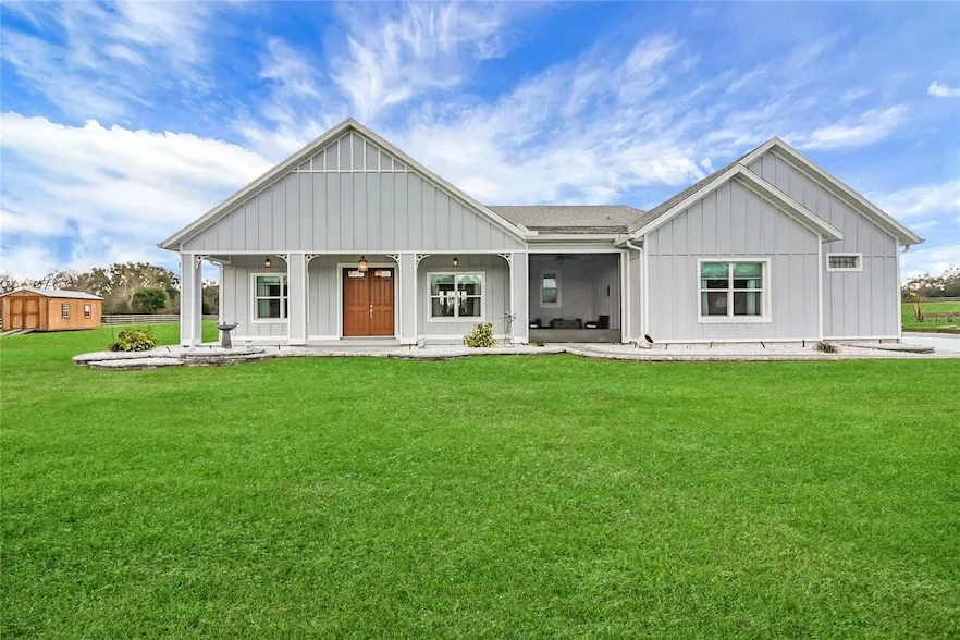 Country living at its finest with this GORGEOUS BLOCK Home covered in Hardie Board planks giving the home a softer and country like feel! This 3 Bedroom + 2 Full bath + 1 Half Bath + Office + Bonus Room Custom BLOCK 2021 built home on 5 fenced ACRES is sure to check off all your boxes! This home will meet all your outdoor needs with a beautiful covered front porch (33 x 6 10) + a screened in side porch (13 x 10) + an extra large lanai (26 x 31) with a 6 person Hot Tub with lounger + a large paver patio area (22 x 15) + a 10 x 20 brown shed + a 10 x 16 cottage shed with electric + a large green house (12 x 17) and plenty of space for all your animals, horses and toys. From the start, when walking up to the house notice the grand 8 feet double doors inviting you to come and enjoy this one of a kind home! This open & split floorplan has volume ceilings, wood like tile flooring, 5 inch baseb...