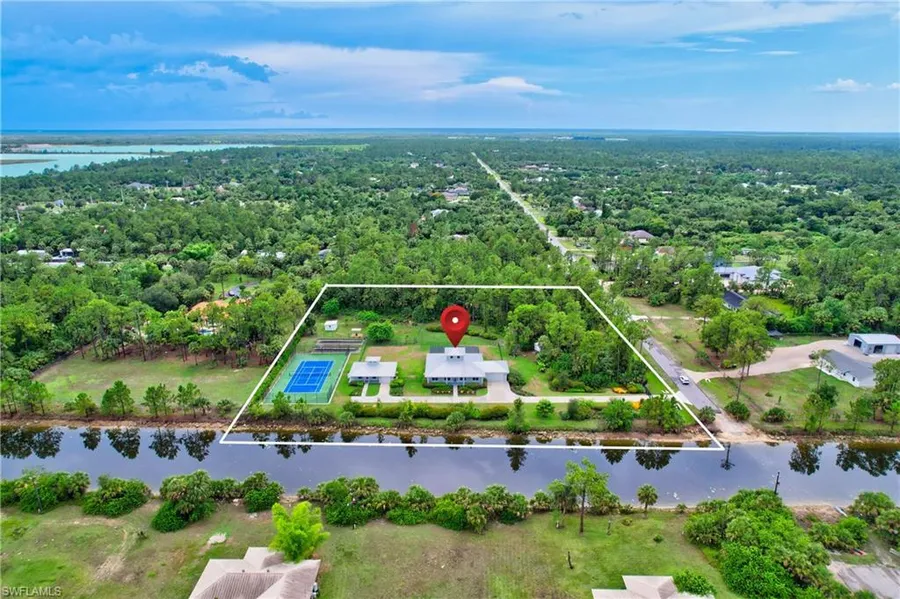 Welcome to this truly unique estate that offers an exceptional blend of privacy and sustainability, ensuring tranquility and seclusion. As you enter through the gate, you'll be greeted by a world of possibilities. Outdoor enthusiasts will delight in the abundance of amenities. The estate features a full-size tennis court, perfect for hosting friendly matches or refining your skills. The pickleball court and basketball hoop cater to the novice or pro player. The bright and spacious main house encompasses 3 bedrooms and 2.5 bathrooms, ensuring ample space for comfortable living. The observatory provides a picturesque setting for stargazing or enjoying beautiful views. The whole-house generator ensures an uninterrupted power supply. The 2.5-car garage offers an electric car charger or RV hook-up. A screened-in saltwater heated pool and spa create a resort-like ambiance. The guest house provides ample space for out-of-town guests and boasts 2 bedrooms and 1 bathroom. You'll find yourself just 15 minutes away from shopping and dining options. Additionally, the proximity to I75 allows for easy access to nearby cities, with Naples Downtown and its beautiful beaches only 30 minutes away.