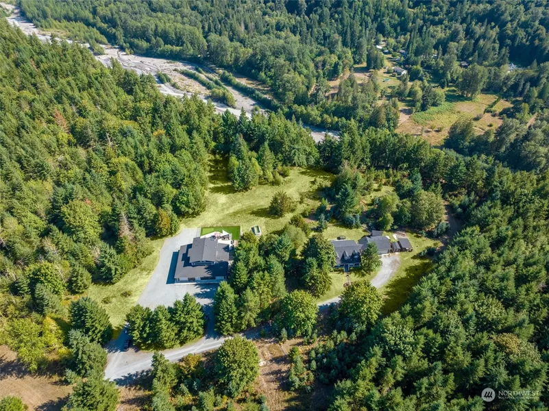 Unbelievable 3BR ADU and a 3BR home w/shop & garage on 5 acres all w/views of Mt Rainier. ADU is designed as a garage - lives like spacious home. 3,520 sq ft main level w/heated stamped concrete floors & divided into many living areas w/16' wide wall of windows featuring outdoors & Mt Rainier, two 15'x15' office, beverage center, multipurpose rm, 3/4 bath, shop & 3-4 car garage. Upper level has kit/fam room, primary suite, 2 BR & full bath. The adjacent 2-story home centers around great entertaining kit/fam room. Upper level has primary suite, 2 BR's w/Jack & Jill bath & utility area. MLS form does not allow for complete info-must see home/ADU!