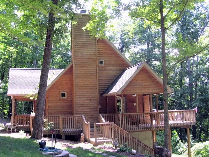 Rustic beauty with excellent location between Bloomington/Nashville. On 5+ acres w/mature timber. Yellowwood Forest is at end of Summers Place. Wood siding, Pella windows, architectural shingle roof, wraparound decks & storage shed. GR has HIGH wood-panelled ceiling, woodburn fireplace, dining area w/french doors todeck. Many wood kitchen cabs/brkst bar. All BR's are master suites w/FBA. 24x16 family room w/freestnd gas frpl w/native stone surround. Big basement storage room. Covered porches.