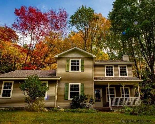 This home offers a Living Room with fireplace. Family Room with an additional fireplace and deck access leading you to wooded grounds. The Kitchen has an eat in breakfast area. Dining room for family dinners and gatherings. The second floor you will find the master bedroom, master bath, walk in closet. There are also two other bedrooms plus another full bath. Laundry also on second floor. The large clean basement has a lot of possibilities for storage & finishing. This Colonial has some great views along with its own pond many seasons to enjoy. With 5 Acres you can take a quiet nature walk through the woods and take it all in and just enjoy. Approx. 35 minute commute to Albany and easy access to the Berkshires and skiing.