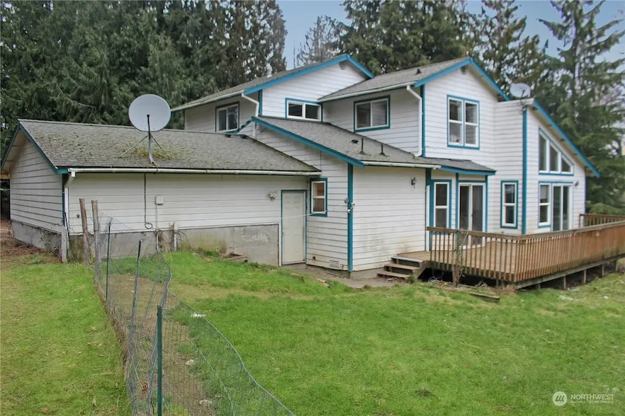Tucked away on a serene 5+ acre lot, you will find a home that is waiting for you to bring it to life. The living room features vaulted ceilings and walk out to back deck. The open concept from living through to the kitchen. Primary bedroom and bathroom are located on the main level along with small recreation room, guest bathroom and utility room. Upstairs are the two other bedrooms and large double sink bathroom. Home is wired for generator. Home has need of someone who will want to create their own perfect oasis by updating the interior, this is the non-structural fixer that requires, paint, cabinets. carpets and flooring but not rebuilding.