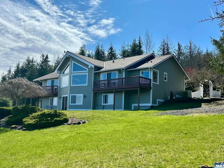 Wonderful, light-filled, water view home on 5 acres. Superb privacy, ample elbow room, great layout & excellent style from this gorgeous home in the hills just 7 minutes from downtown Sequim. Recently updated with new 30 yr roof, new siding, refinished HW floors and new paint in the interior and exterior. All essential rooms on the main level including large living room with huge view windows & propane fireplace, primary BR w/private deck & primary bath w/views from soaking tub, 2nd BR suite and a large modern kitchen w/cherry cabinets & granite counters, dining room w/doors out to deck, large office & utility/mud room. Handsome office off entry w/built in desk and wooden cabinet/closet. Downstairs offers 3rd BR suite, large living room w/pool table and sitting area w/slider to backyard, plus a second large office with covered sink. Partially covered deck off of the dining area to enjoy ...