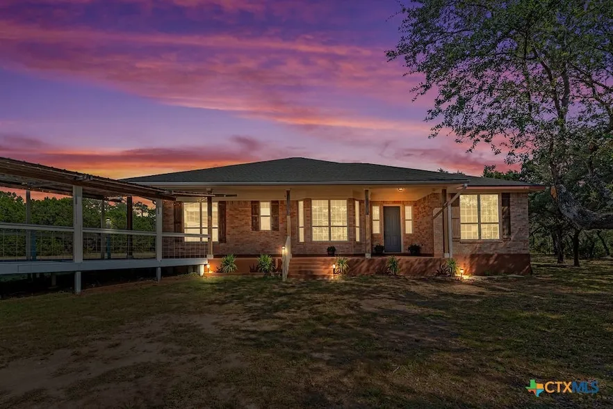 This handsome ranch home is situated in the Ledge Rock community, which boasts numerous beautiful features. It is located on a sprawling 5,100-acre lot. Where Hill Country sunsets span miles. Lush green panoramic views all around. It is an incomparable little gem on a private road. Many trees offer shade during Texas summers. A welcoming, large front porch would be a perfect spot for a morning cup of Joe or a glass of wine after a long day. Your living room is bright and airy, featuring 14-foot high-beamed ceilings, beautiful wood floors, and a wall of windows that allow natural light to flow throughout the house. Pocket doors throughout the house give this home an old-world feel. Your kitchen features granite countertops, a kitchen island with double-sided storage, rich colored cabinets, a pantry, a tile backsplash, a smooth cooktop stove, and a breakfast area overlooking the backyard. ...
