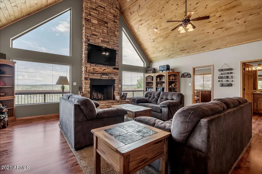 This Turn Key A-Frame Retreat is located on a Rare 5+ Acre Lot! Enjoy Breathtaking Views and Sunsets from the Wraparound Trex Deck & Front Porch. Explore the National Forest Trails Via the Private Access Gate in a Off-Road Vehicle or Warm Yourself in Front of the Gorgeous Stone-Faced Fireplace. Open Floorplan and Vaulted T&G Ceilings throughout. Three Bedrooms w/ Adjoining Bathrooms plus a Loft Ensure Everyone has Room to Spread Out. 3 Car Garage slash current Game Room provide Plenty of Space to Gather. The Half-Acre Landscaped Lawn is Surrounded by Fire Maple Trees which are Spectacular in the Spring and Fall! The Southern Sloping Exposure is Ideal for adding Solar Panels for Off-Grid Living. This is the Perfect Home for Family Gatherings, Weekend Getaways, Entertaining, or AirBnb!