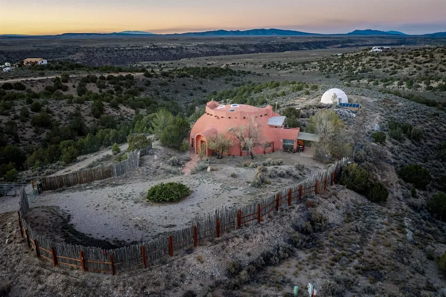 A Dreamy & Wondrous Masterpiece in Taos, New Mexico ~ Perched on five-plus pristine and private high-desert acres at the end of Tune Drive, you will discover "The Dreaming Dome," a dreamy and wondrous architectural masterpiece. Truly whimsical and delightfully outlandish in all the best ways, this structure as featured on HGTV and in Parade Magazine as "The Most Beautiful House in America" is more of a sculpture than your standard residence. Inspired by the rainforests of Costa Rica and the New Mexico alpine high-desert, this sustainable, monolithic designed dome includes a yoga hut in the backyard, engulfed by the most stunning views the region has to offer. Upon stepping inside this architectural wonder, you are greeted by a visual dreamland defined by 35-foot ceilings, hand-finished adobe-style walls in rich earth tones, hand-carved doors, travertine tile, luxurious stained-glass chan...