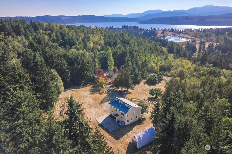 This beautifully maintained property has something for everyone! Bay and mountain views, over 5 acres, and private Larry Scott Trail access. Enter the sunny open lot through your own private gate, parking for everyone, RV hookups, tool shed, and a boat garage. Large fenced garden area. Basketball/athletic court and playhouse. Step into this well cared for home and follow the African Cherry Hardwood floors up to the open living space. Large kitchen with granite countertops, maple and mahogany cabinets, Jenn-Air oven, and built in Electrolux Icon refrigerator. Included are the 2022 LG washer and dryer. Enjoy the expansive views of the Olympic Mountains while sipping coffee from your covered deck.