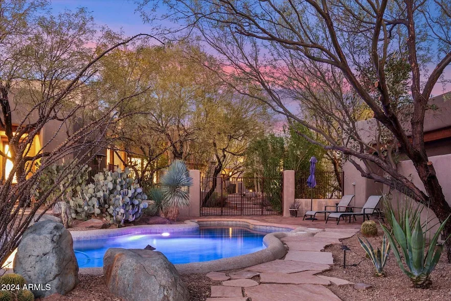 BACK ON MARKET - BUYER COULD NOT PERFORM! Stunning Cave Creek Estate on 5.2 Acres with Desert Views!Located in the heart of Cave Creek, this exceptional estate offers 5.2 flat acres of serene desert landscape, backing up to 300 acres of protected desert preserve. With no HOA, this property provides ultimate privacy and flexibility, ideal for a peaceful retreat or short-term rental opportunities. With over 7,600 sq. ft. of living space, the main home spans 4,728 sq. ft. and features 4 bedrooms and 4.5 baths. A gourmet kitchen designed for entertaining includes double islands, granite and marble countertops, and custom alder cabinetry. Rich flagstone and hand-honed wood floors, 4 fireplaces, and floor-to-ceiling windows create a warm, inviting atmosphere throughout the home. The spacious 2,040 sq. ft. MULTIGENERATIONAL guest house offers 4 bedrooms and 3 baths, perfect for extended family ...