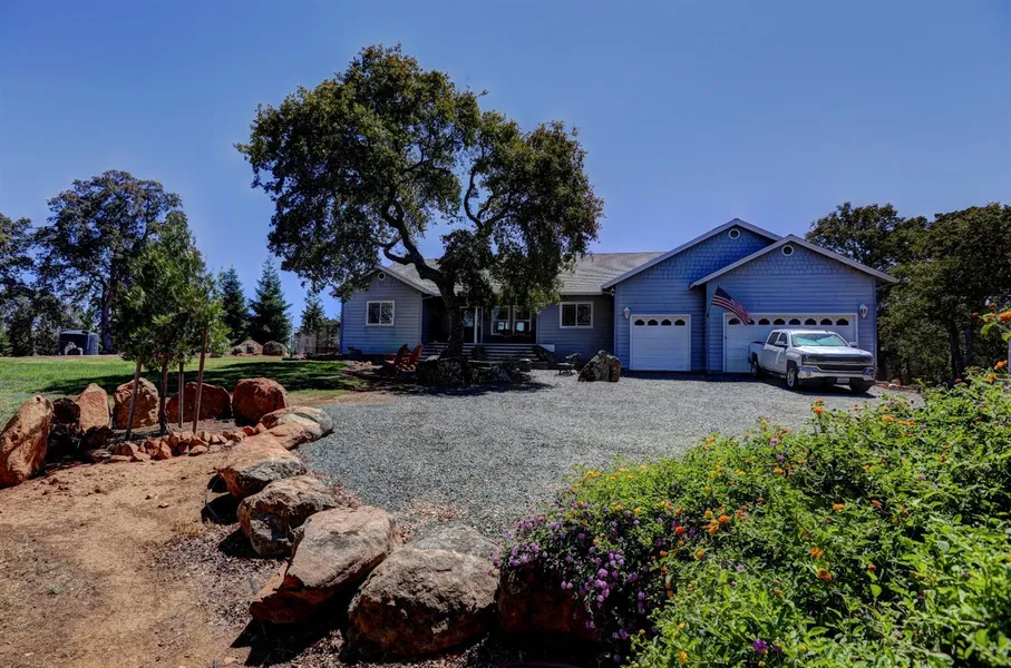 Gorgeous Custom home in Peoria Ridge phase IV! Vaulted ceilings in the living area with views out every window. Desirable floor plan with primary master suite on opposite side of living space. 2 master suites. Sile stone counter tops, tons of custom details including extra tall baseboards, custom fixtures & lighting throughout. Butler's pantry, large laundry. Great view deck off living and master. 10,000 gallons of BVID water storage, with 2600 feet of two inch water lines running to irrigation and 2 inch hook up for fire suppression. Custom rock details, gorgeous oaks and rock outcroppings. Property backs up to a large ranch for privacy, tall living fence for privacy also. Property is set up to install more fruit trees, thoughtful use of foundation trees and shrubs are there for landscape foundation plus it could be used for horses, etc. This is a must see foothills property.