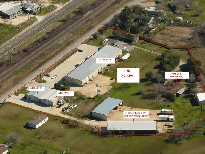 Ideal owner occupied opportunity! This mixed use property is well situated in the College Station growth corridor. This 5.26 acre property includes an 11,250 sqft strip center, two 2,400 sqft office warehouse structures, a 1000 sqft office, and 16 covered boat and RV rental spaces. Combined this property has over 17,000sqft of leasable space not including the boat and RV spaces.