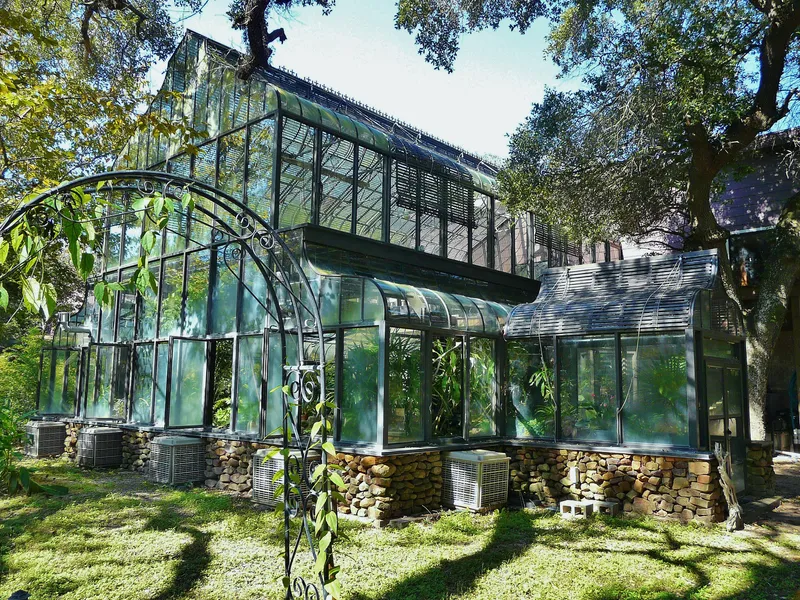 HISTORY: The original development of The Oasis grounds and buildings was the work of Hazel Gates Woodruff, a wealthy heir to the Gates Tire and Rubber Company of Colorado. She was an accomplished and avid gardener and dog breeder and moved to Cat Spring to build her dream compound. From actual receipts, it has been documented that Kit, as she was known to her friends, had spent well over three million dollars on the unusual improvements before she passed away prior to finishing the main lodge. However, the greenhouses, the gardens, the conservatory and the guest houses were all built by her with great attention to detail and considerable expense. The current owner converted some of the buildings to guest quarters and added significantly to the value and desirability of the improvements.