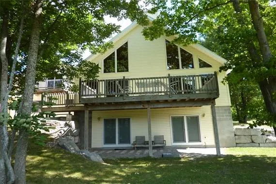 This estate size parcel offers over 5 acres of land with 180 feet of frontage on Grand Lake. This spectacular home features a 7 car garage with top notch construction from beginning to end. The open floor plan with cathedral ceilings and knotty pine interior offer a warm and inviting atmosphere. The view from the home with the manicured lawn and pristine waters of Grand Lake are impressive to say the least. This 3 bedroom, 3 full bath home is well constructed and maintained. Lake front properties that offer the privacy of this parcel are very rare.