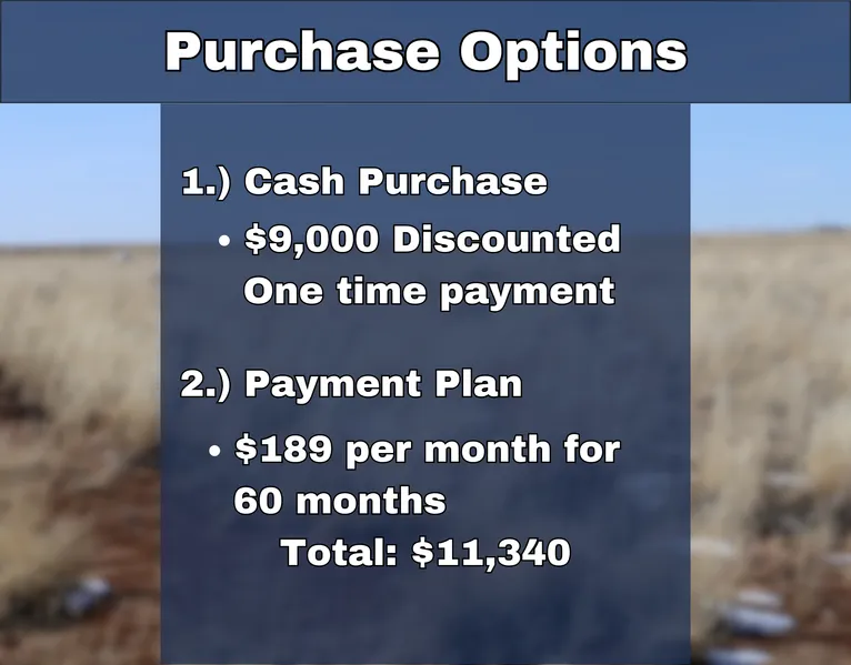 Your land-buying journey begins with a simple down payment of $189. With a term length of 60 months, you have the flexibility to choose your preferred due date each month for your payments. We aim to make the process of buying your dream property quick, stress-free, and easy.