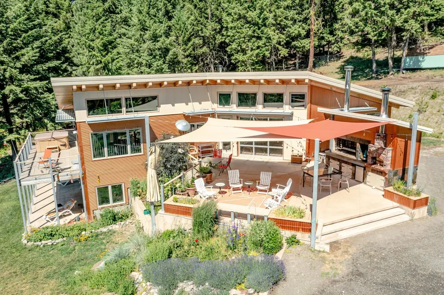 Stunning views throughout the house of Lake Roosevelt and wildlife in this beautifully situated home just minutes from town. This home was architecturally designed for maximum efficiency and low maintenance. Features include open concept floor plan upgraded fixtures throughout. Hydronically heated concrete floors powered by geothermal, 8'' walls for superior insulation and quiet. Swedish wood stove for cozy ambiance. A Chef's kitchen with stainless steel appliances, induction cook top, and beverage fridge all set in beautiful quartz countertops. Outside is a South American barbecue, brick oven, and sink on the spacious patio. Roll up glass doors allow for seamless indoor-outdoor entertaining of guests. Primary suite has another roll up door to the deck and hot tub area for outside sleeping or star gazing. Primary bath includes slate tile bathroom with custom shower. Lower level has 2nd oversized bedroom with sitting area, walk out patio, private entrance, and a full bath. There is a 20 case wine cellar, large storage room and recreation/bonus room. Fire resistant exterior cladding with Ceraclad and Kynar coated steel and metal roof. Outside includes a huge 30X40 shop/garage wired with 220v for your electric vehicle and all your toys. Property also includes an orchard, vineyard, flower gardens, and a raised bed vegetable garden all fenced and gated. Come see this amazing dream home today.