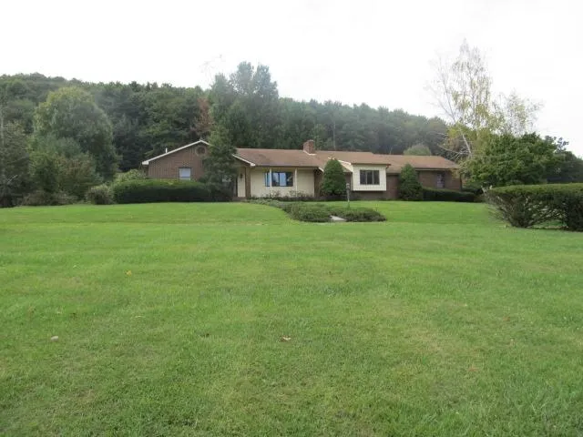 Country living in a contemporary ranch house. Huge family room with wood stove and two large storage closets. Formal living room with wood burning fireplace. Dining room with atrium doors leading to a large private deck and arbor with swing. Full basement and an attached double car garage. Situated on a level 5.34 acres suitable for organic crops or horse pasture.
